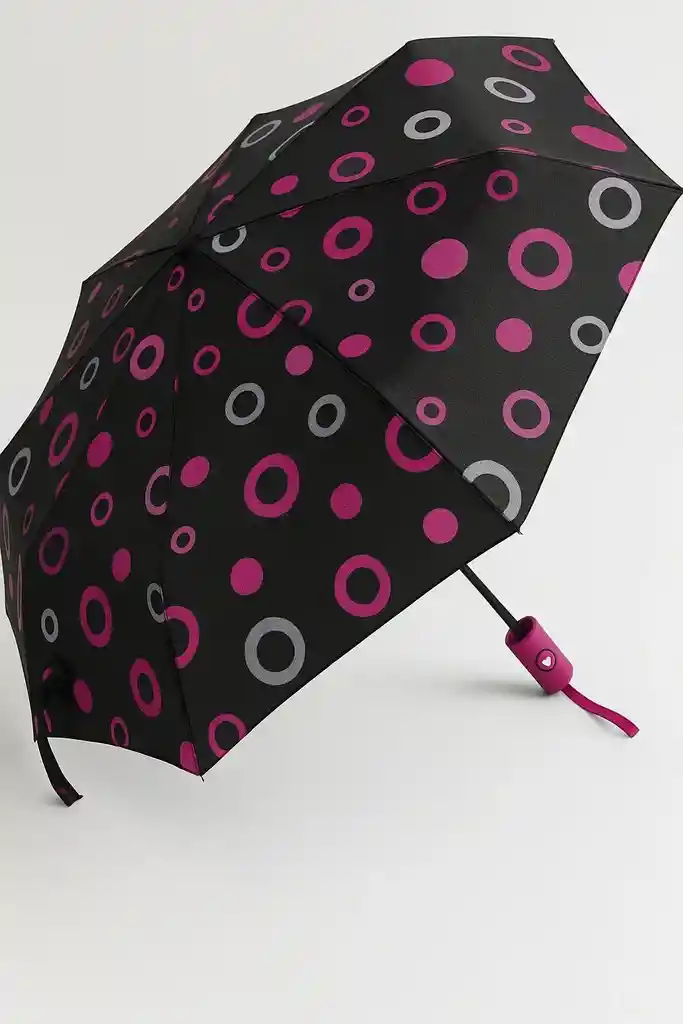 Sombrilla Paraguas Automatica Valentina Gold 8 Varillas Fondo Negro Circulos De Colores Fuscia y blanco. Ideal para protegerte de la lluvia y el sol