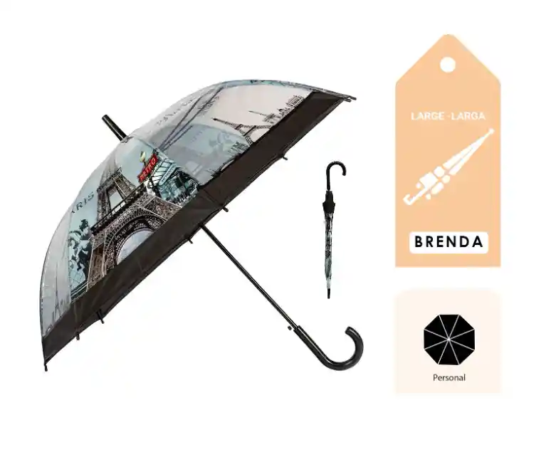 Sombrilla Automática, Larga, Mujer Medida 23″ Dimensiones 116.84 Sombrilla automática Puntera plástica mango curvo Estructura metálica, plástica transparente