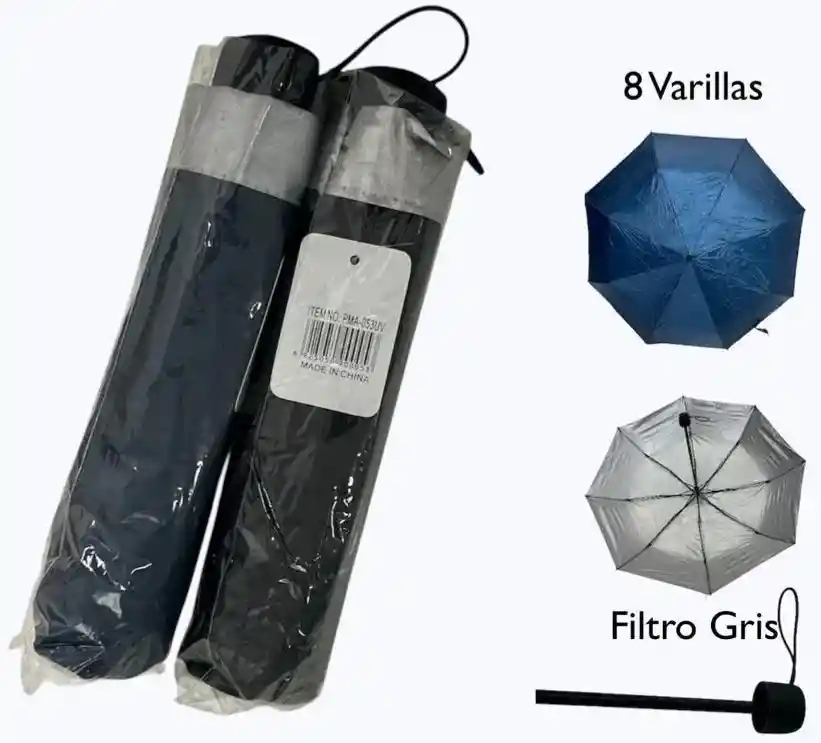 Varillas: Cuentan con 8 varillas, lo que sugiere una estructura reforzada y resistente al viento. Colores: Disponibles en azul y Negro.(COLOR SUJETO A DISPONIVILIDAD DE LA TIENDA) Características: Tiene un filtro UV, ideal para protegerse del sol. Portabilidad: Con de forro, diseñados para ser compactos y fáciles de transportar.
