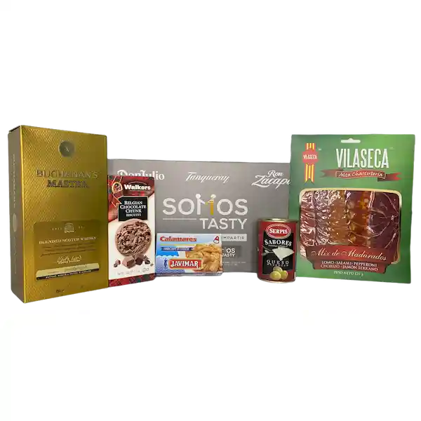 Esta Ancheta De Somos Tasty Incluye Los Siguientes Productos: Whisky Buchanans Master 750Ml, Mix De Madurados Vilaseca 125G, Aceituna Serpis De Queso Manchego, Galletas Walkers Belgian Chocolate Chunk 150G Y Calamares Javimar En Salsa Americana