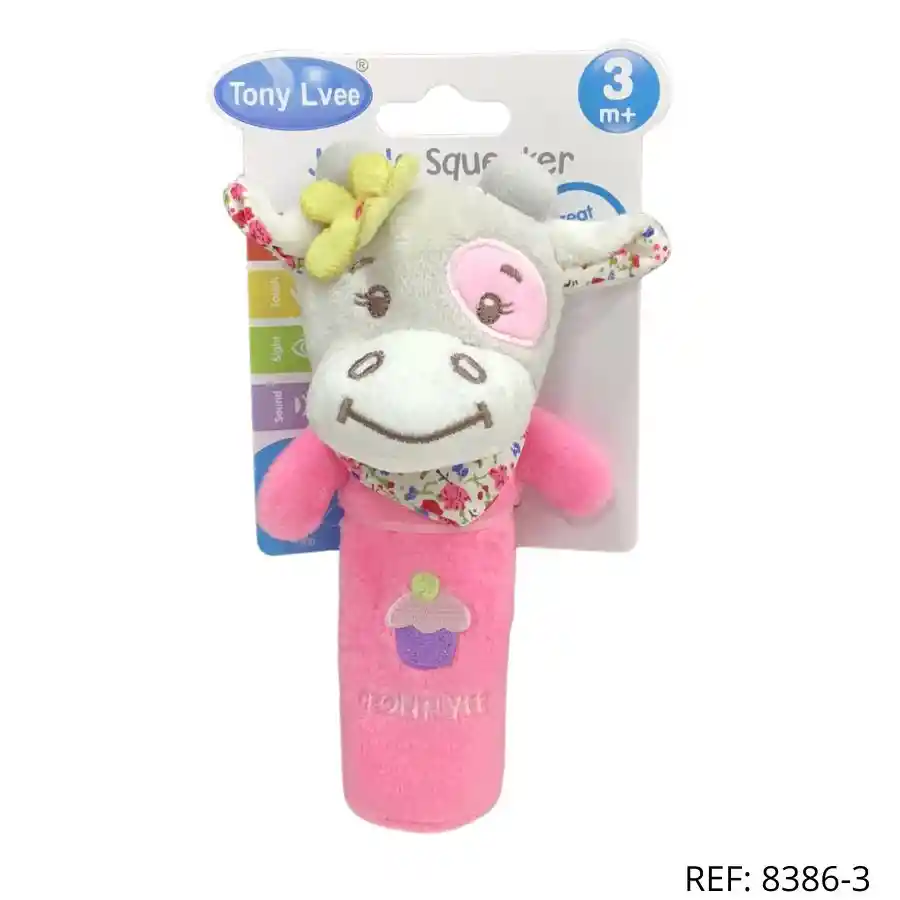 Sonajero vaca rosada con flor. Suave, seguro y perfecto para bebés curiosos y sonrientes.