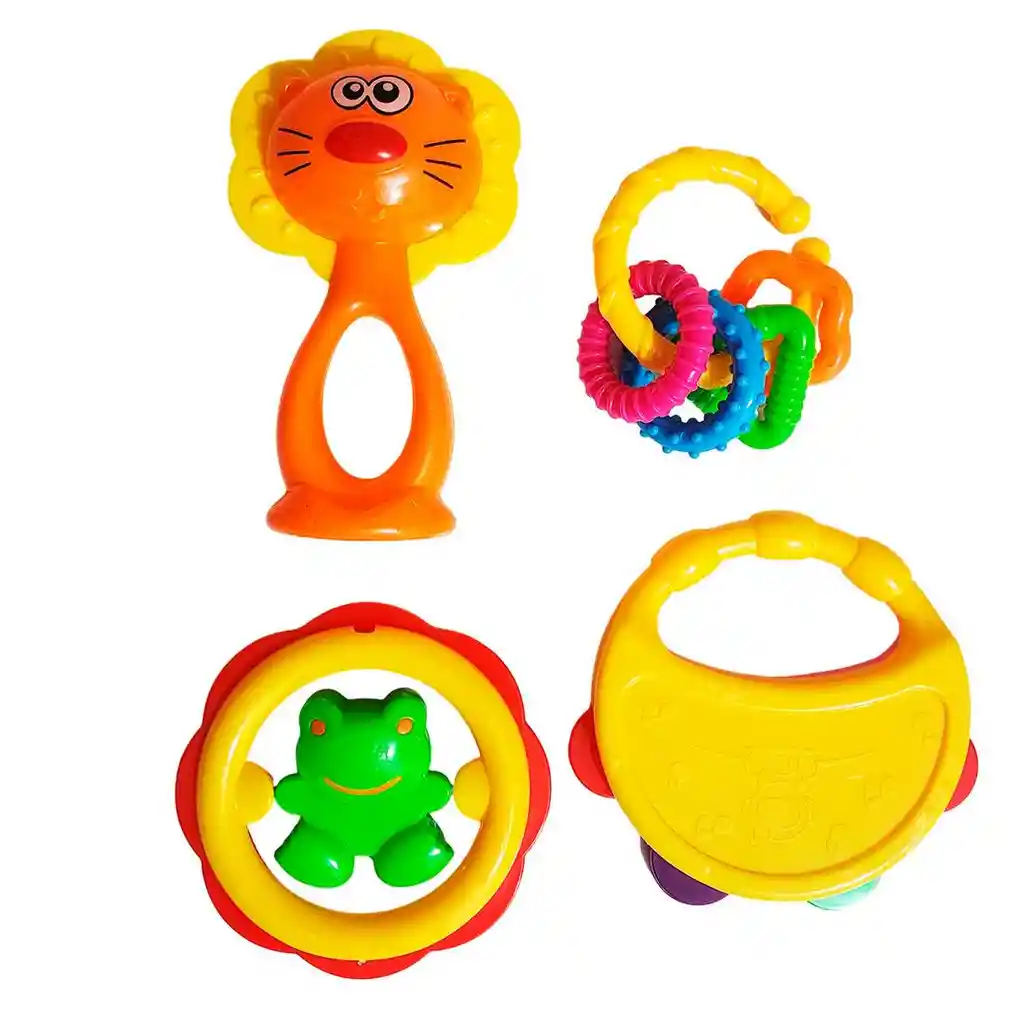 ¡Despierta un festival de sensaciones y alegría en tu bebé con este completo y vibrante set de sonajeros y mordedores! Este paquete de cuatro juguetes únicos, con colores surtidos, está diseñado para acompañar cada etapa de su descubrimiento: desde una pandereta y una maraca de león que estimulan su desarrollo auditivo, hasta un aro con ranita y un llavero de texturas perfectos para explorar con sus manitas y aliviar las encías. Cada pieza cuenta con un diseño ergonómico y colores de alto contraste, fácil de sujetar para fomentar la motricidad fina y la coordinación. Es el regalo de bienvenida ideal que ofrece una sinfonía de estímulos para convertir cada momento de juego en un divertido y fundamental aprendizaje. Ficha Tècnica: Material : Plástico ABS , No toxico Edad Apto + 3 años Dimensiones : 24 cm x 17 cm x 4 cm Certificado de conformidad: E5-0359-2021 Referencia: JB923 ** _Para defectos de fábrica o retractos: \_Por favor revise el producto apenas lo reciba y antes de usarlo. No aplican ley de retracto o defectos de fábrica luego de usar el producto. Se manejan máximo 5 días para reportar defectos de fábrica (por ejemplo, producto funciona mal, piezas faltantes, rotas, etc). Para hacer efectiva la devolución el producto debe devolverse con el empaque original, el cual debe estar en buen estado, incluir todos los documentos y las partes completas y sin daños.