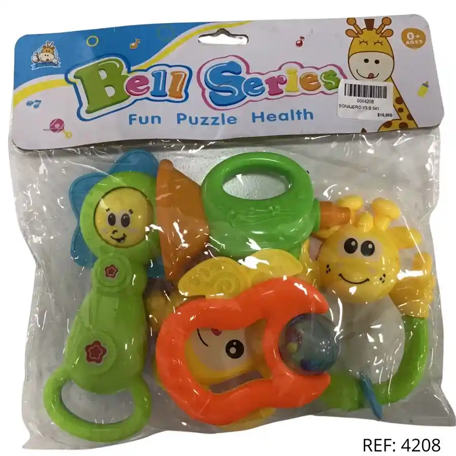 Set de cinco sonajeros con divertidas formas y colores. Ideal para estimular los sentidos del bebé desde los primeros meses.