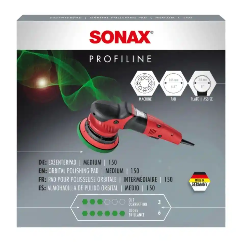 Esponja de dureza media, alta densidad y poros abiertos para el pulido a máquina de pinturas con pulidoras excéntricas. Larga vida útil y resistencia a la temperatura gracias a la buena ventilación y refrigeración especial del centro. Cambio rápido del disco gracias al cierre de velcro. Excelente manejo gracias al borde biselado de la esponja. Para plato soporte de 150 mm de diámetro. Ideal para la aplicación de SONAX PROFILINE NP 03-06, SONAX PROFILINE EX 04-06, así como SONAX PROFILINE PerfectFinish. Aplicación del producto: Coloque el disco de pulir centrado sobre el plato soporte. No sobrecalentar la zona de pulido. Para proteger la esponja, no pulir nunca con alta presión ni inclinarla extremadamente. Sople regularmente aire comprimido durante el uso. Limpie las almohadillas de pulido con regularidad y no utilice nunca distintos agentes de pulido en una misma almohadilla.