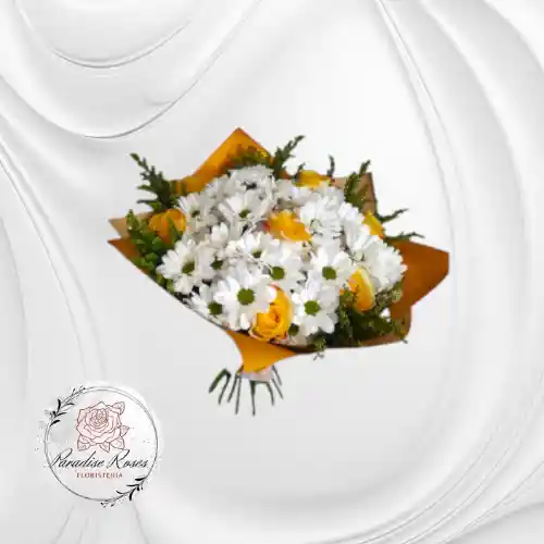 Un bouquet elaborado con margaritas blancas y 5 rosas amarillas que expresan amistad y felicidad. Perfecto para iluminar cualquier día. ideal para Amistad, Recuperación / ánimo.