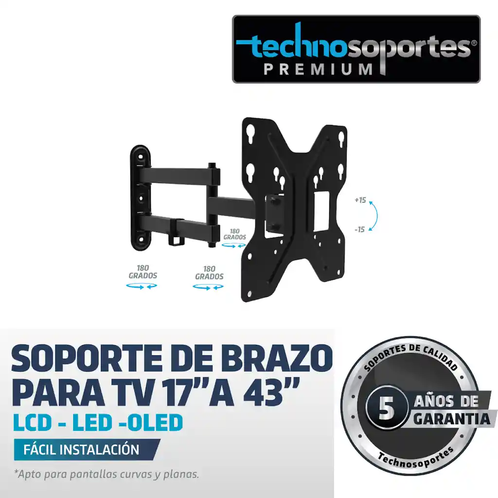 Base de brazo 17″a 43″ pulgadas Inclinacion de 20 grados rotacion en su mismo eje de 90 grados 5 años de Garantia Para Televisores, LCD, LED y plasma Diseñado para una fácil instalación kit completo de instalacion Ultraliviano y seguro Soporta hasta 20 Kg Material hierro