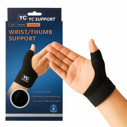 marca YC Support es un soporte ortopédico diseñado específicamente para brindar estabilidad y protección a la muñeca y el pulgar. Basado en las características visibles y las especificaciones típicas de este tipo de soportes de compresión ajustable, Material: Neopreno transpirable de alta calidad que retiene el calor corporal para mejorar la circulación y aliviar el dolor. Diseño: Ambidiestro (se ajusta tanto a la mano derecha como a la izquierda). Ajuste: Sistema de cierre con velcro (hook and loop) que permite una compresión personalizada y fácil colocación con una sola mano.