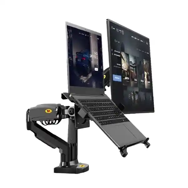 Uso: Accesorio para LCD y portátil para oficina y hogar. Características: Para monitores de 13 a 32 pulgadas y portátiles hasta 17 pulgadas. * Peso que soporta brazo portátil: hasta 6 Kg. * Peso que soporta brazo monitor: hasta 9 Kg. * Sistema de montaje por prensa o grommet. * Prensa para superficies hasta de 8 cm. * Fácil sistema manual de ajuste por sistema de tensión. * Con sistema de gas que permite perfecto balance en cualquier sentido. Material: Soporte: aluminio de calidad aeronáutica cuenta con una superficie de plástico molde de inyección anti-arañazos. * Bandeja: Acero y plástico. Ajustes: * Ajustable en altura: de 8 cm hasta 40 cm. * Alcance máximo horizontal de los brazos de 44 cm. * Bandeja ajustable en ancho: de 24 cm a 42 cm. * Rotación pantalla: +180°~-180°. * Ángulo de Inclinación: +90°~-45° * Ángulo de Giro: +90°~-90° Dimensiones: Soporte: 63 cm largo x 22 cm ancho. Bandeja: 30 cm ancho x 28 cm largo x 0,5 cm grosor. Color: Negro.