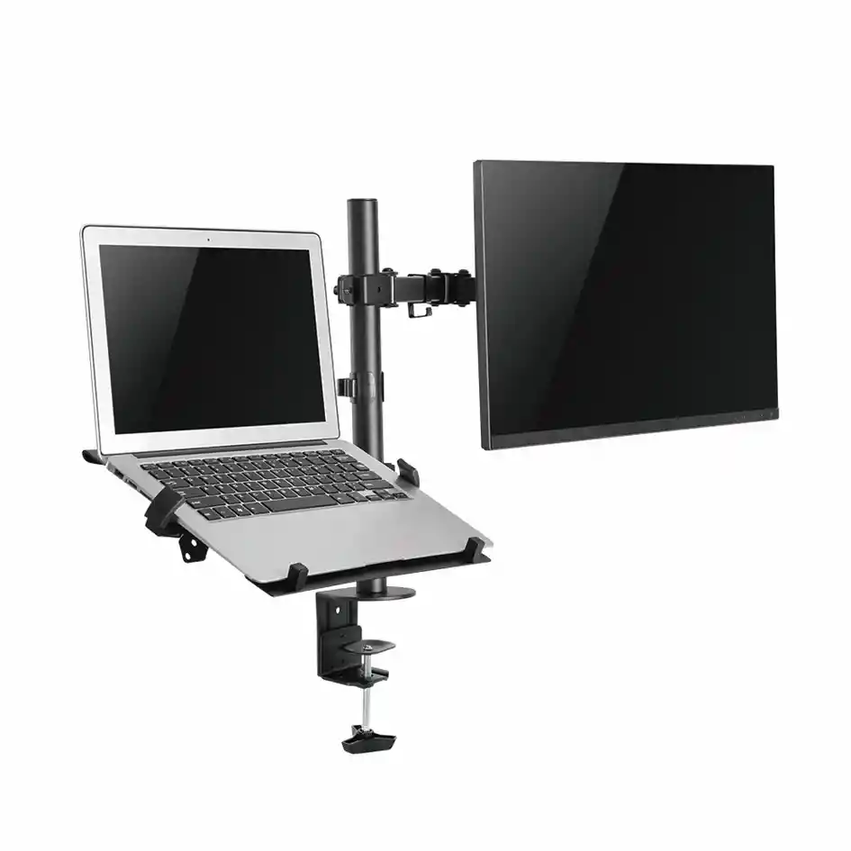 Uso: Para oficina y hogar. Características: Para monitores de 13 a 32 pulgadas con peso máximo de 8 kg. * Para portátiles hasta de 15.6 pulgadas. * Cumple norma Vesa 75×75 100×100 mm. * Montaje disponible en prensa y grommet. * Prensa para superficies de espesor desde 1 cm a 8 cm. * Sistema interior para guardar cables. Material: Aluminio, Acero y Plástico. Ajustes: Alcance máximo horizontal de los brazos 40 cm. * Ajuste de altura de 8 cm a 44 cm. * Inclinación regulable entre -15° y +15°. Color: Negro.