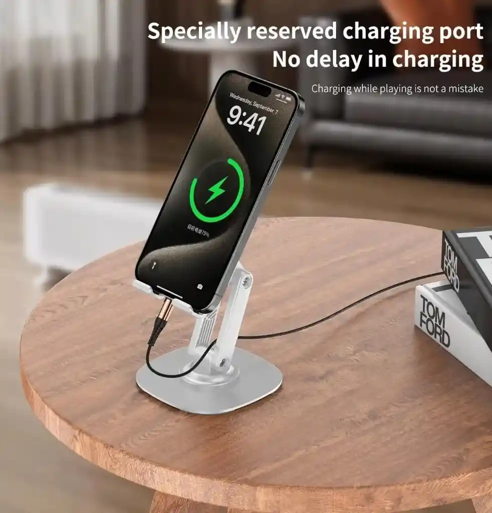 El Soporte Para Celular y Tablets en aluminio con Rotación de 360° para Escritorio es un accesorio versátil y robusto diseñado para proporcionar una base estable y ajustable para tus dispositivos móviles. Fabricado en metal de alta calidad, este soporte garantiza durabilidad y resistencia. Su función de rotación de 360⁰ grados permite ajustar el ángulo de visión de manera cómoda y precisa, lo que lo hace ideal para videollamadas, lecturas, trabajos, o entretenimiento. Compatible con una amplia gama de celulares y tablets, su diseño elegante y moderno se adapta perfectamente a cualquier espacio de trabajo o hogar. Color Disponible : Negro.
