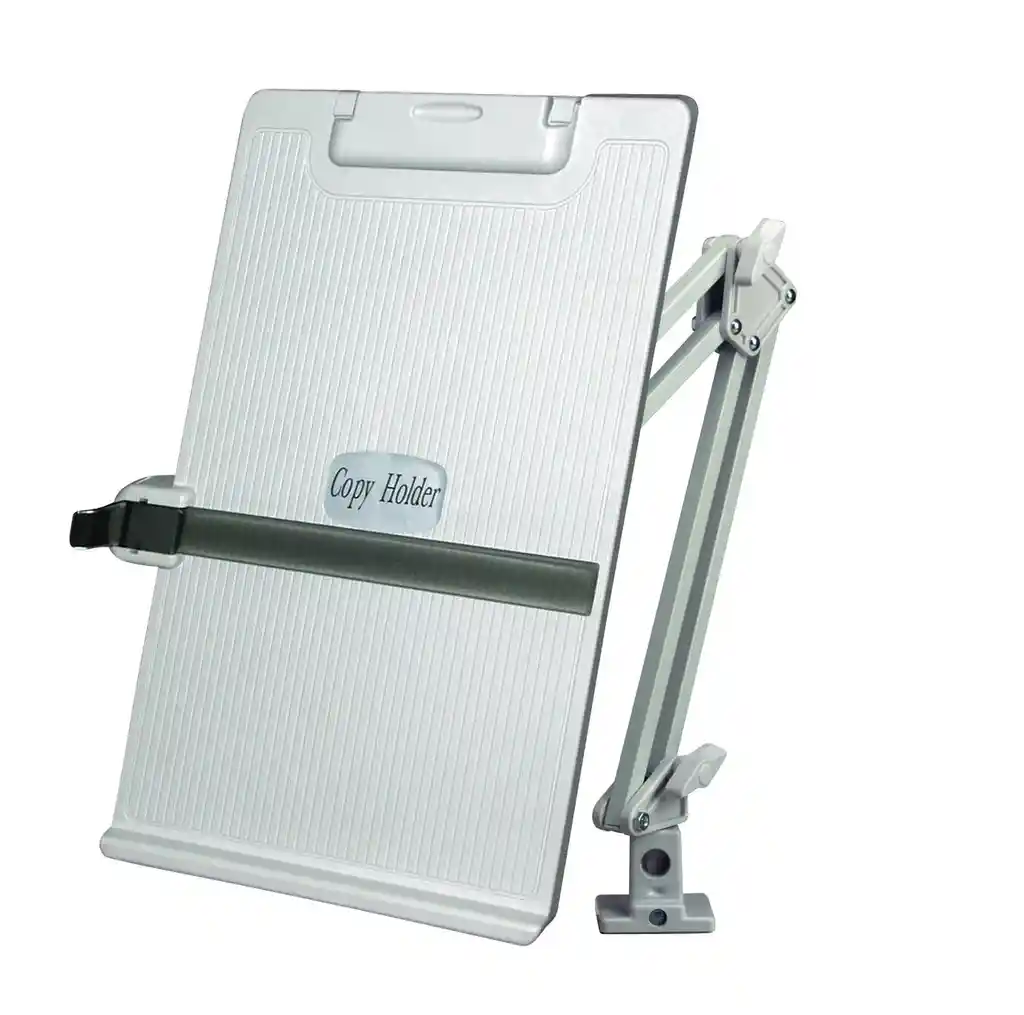 Accesorio para oficina. Características: Para uso de documentos en diferentes tamaños: hojas carta, oficio y A4. * Clip para sostener las hojas. * Regla guía con aumento. * Plegable y portátil.. Ajustes: Altura: desde 10 cm hasta 54 cm. * Máximo 30 cm de distancia. Material: Plástico de alta resistencia. Estructura metálica. Base con cauchos antideslizante Dimensiones: Superficie de apoyo: 22 cm de ancho x 33 cm alto. Color: Aluminio. Garantía: 1 año por defectos de fabricación.