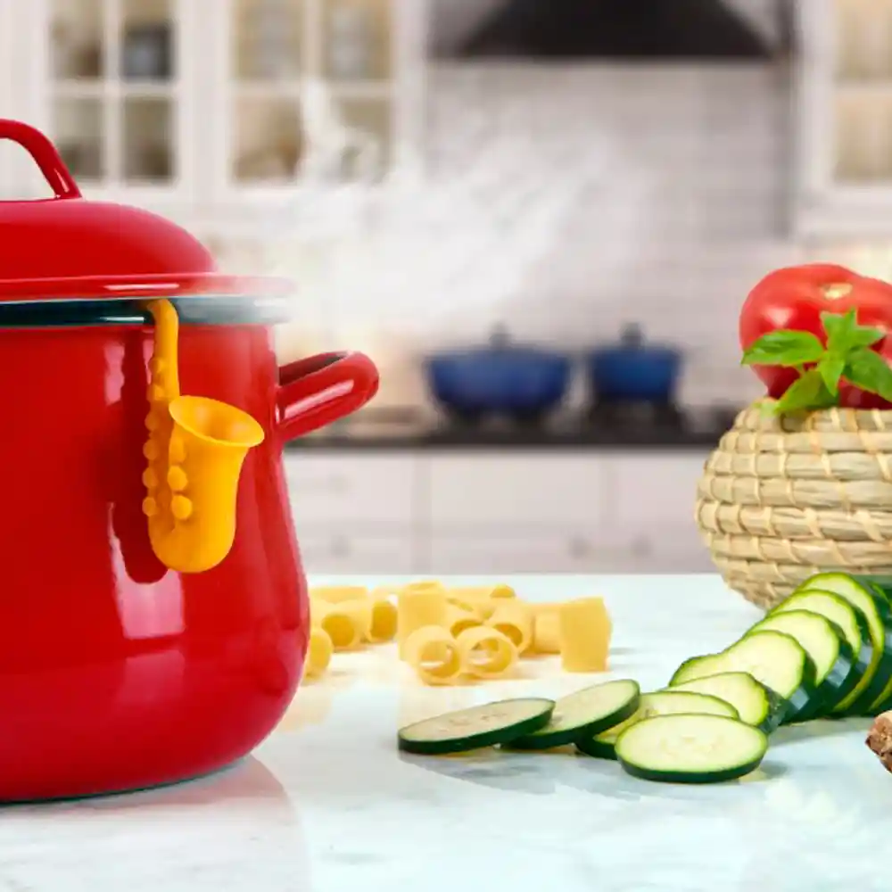 Este pequeño saxofón rojo te ayudará en tu tiempo de chef, sostendrá la tapa de tu olla para que quede entre abierta y deje salir el vapor y queden deliciosos tus platillos.
