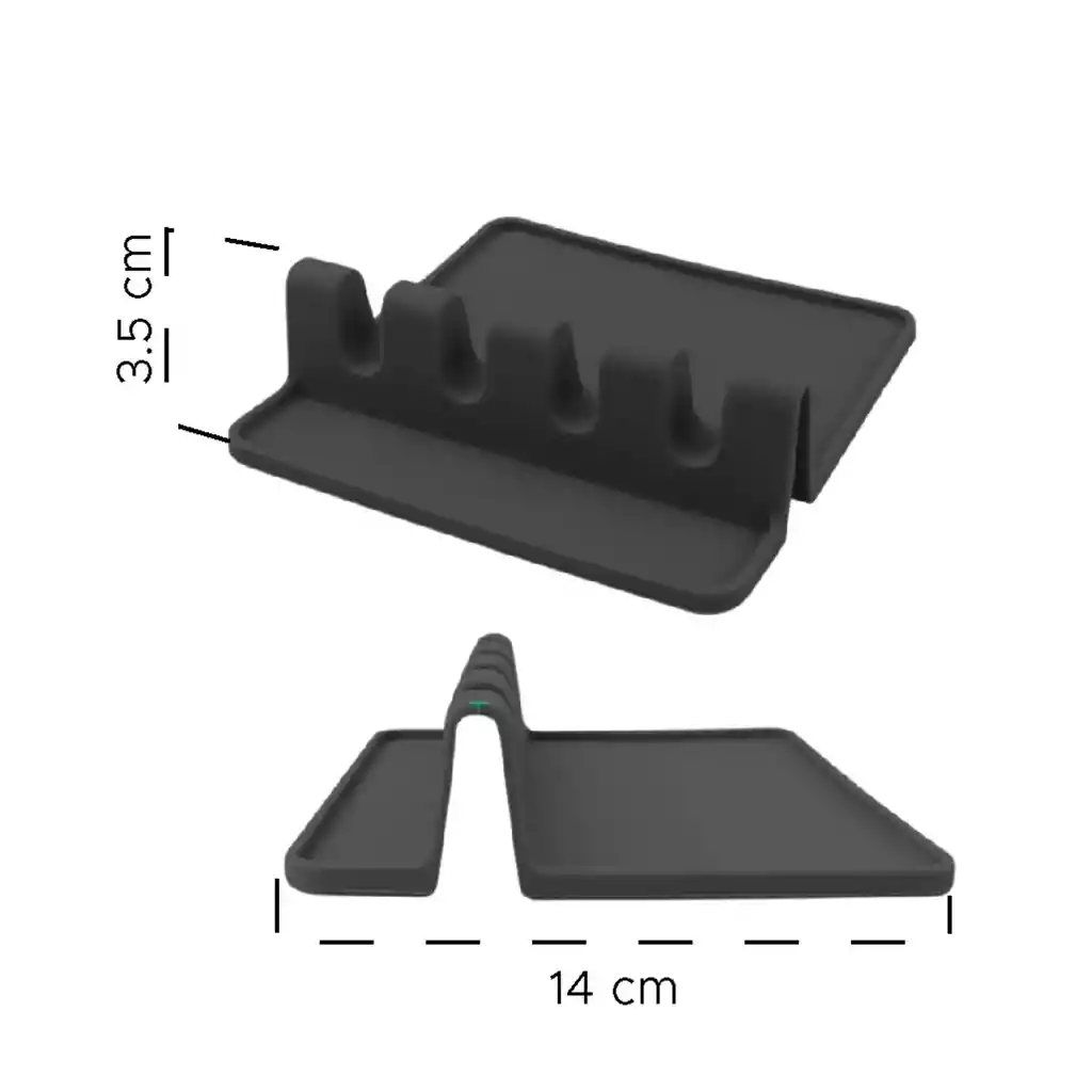 Soporte / Escurridor de silicona para utensilios de cocina, diseñado con ranuras que permiten sostener cucharas, espátulas y pinzas mientras cocinas. Su base amplia evita derrames y mantiene la encimera limpia. Resistente al calor, antideslizante y fácil de lavar, ideal para mantener el orden en la cocina. Color negro