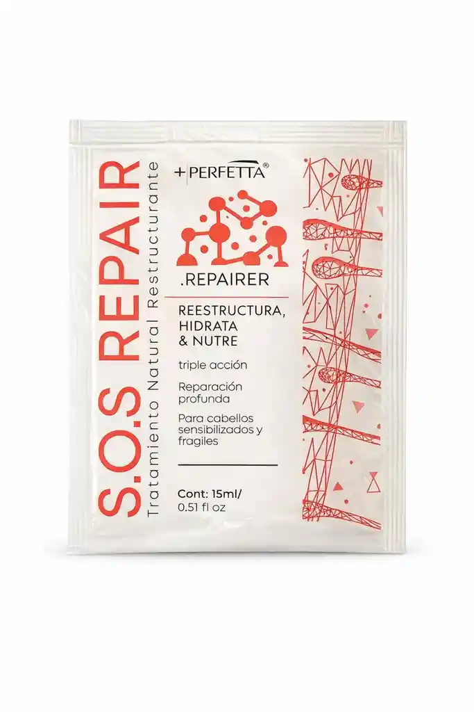 Tratamiento S.O.S Repair de la línea +Perfetta, un reestructurante intensivo diseñado para cabellos frágiles y sensibilizados. Pertenece a la categoría de cosmética profesional para la restauración profunda de la fibra capilar. 💧 Características técnicas: Triple acción: Reestructurante, nutriente e hidratante. Reparación focalizada: Actúa directamente en el folículo piloso y la fibra. Fórmula segura: Producto libre de parabenos. Presentaciones: Disponible en sachet de 30ml y pote de 350g. Beneficios: Recupera la vitalidad de tu melena con el Tratamiento S.O.S Repair, que devuelve la suavidad y textura natural al instante. Sentirás un cabello más fuerte, elástico y visiblemente rejuvenecido tras procesos químicos o daños externos. ✨ Modo de uso: Aplica sobre el cabello limpio y húmedo de medios a puntas. Deja actuar de 5 a 10 minutos para una absorción profunda y enjuaga con abundante agua. Encuentra este tratamiento capilar profesional en tu Tienda de Belleza Bella.