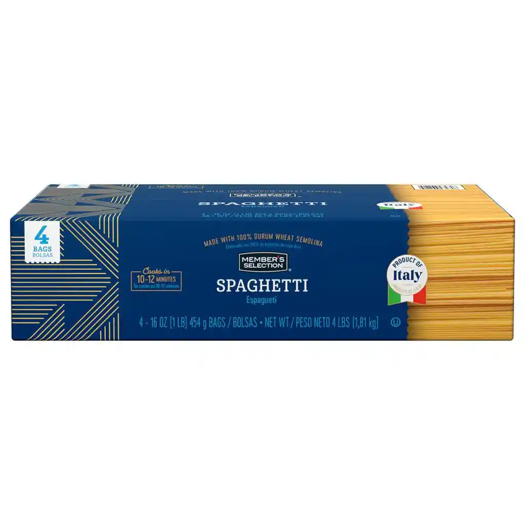 Espagueti hecho a base de sémola de trigo duro en presentación de 4 unidades | Peso unitario: 454 g | Peso Neto: 1.82 kg | Contiene alergenos principales como trigo y gluten | Ingredientes libres de colorantes y sabores artificiales | País de origen: Italia.