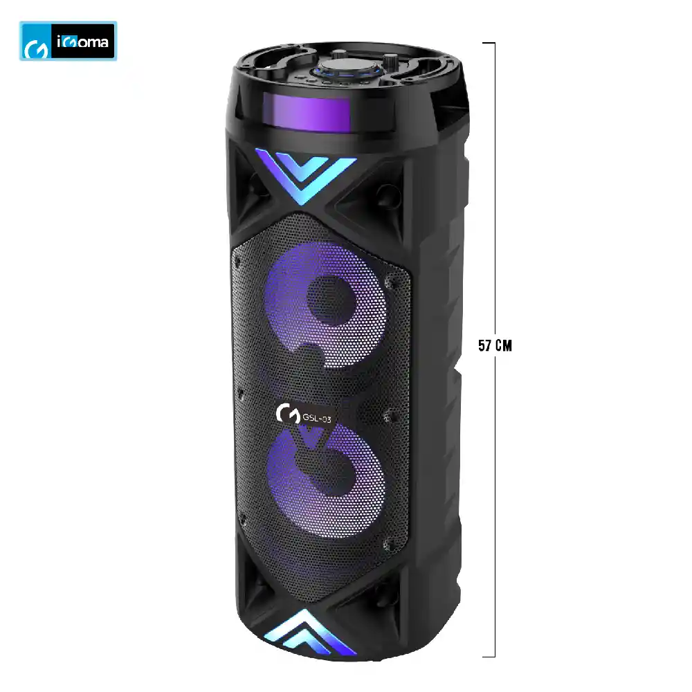 Marca: IGOMA Modelo: Gsl-03 Cantidad de parlantes: 2 Bluetooth Wi-Fi: No base: No luces LED: Sí micrófono: Sí función karaoke: Sí radio: Sí Es portátil: Sí Especificaciones: Parlante Torre con sonido de alta fidelidad, Puerto usb, luces LED de colores para altavoces, altavoces de 6,5 IN conexión de micrófono control de volumen principal batería de litio 3.7v/4.500 MAH. Output: 15 W x2. Frecuencia Bluetooth: 45 Hz-18 KHz. Medida : 57 cm de alto x 20 cm de ancho. Entrada auxiliar3.5