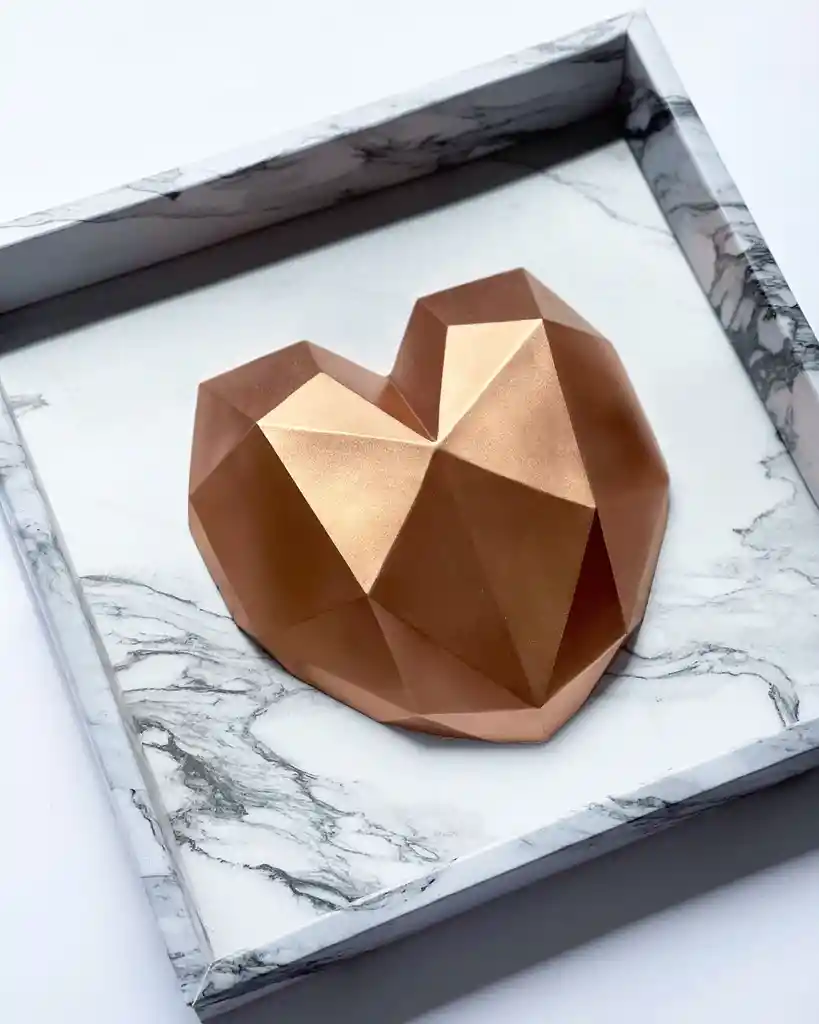 Corazón geométrico del chocolate que elijas, relleno de brownie melcochudo y centro liquido de arequipe o crema de avellanas. Mediddas: 18 cm largo x 18 cm de ancho x 4,5 cm de alto. oreo, sin oreo, relleno de avellanas o relleno de arequipe