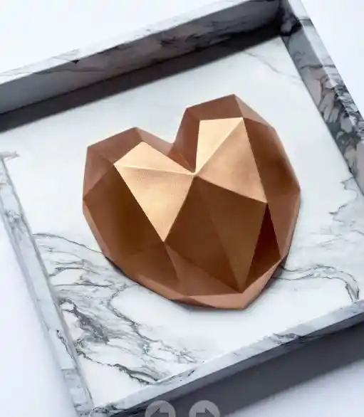 Corazón geométrico del chocolate que elijas, relleno de brownie melcochudo y centro liquido de arequipe o crema de avellanas. Mediddas: 18 cm largo x 18 cm de ancho x 4,5 cm de alto. oreo, sin oreo, relleno de avellanas o relleno de arequipe