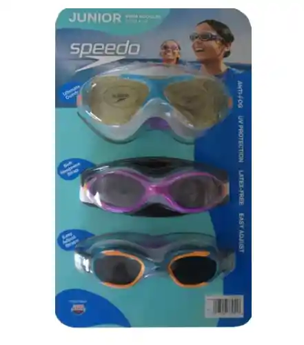 Set de 3 Gafas de natación SPEEDO. ORIGINALES. para niños o niñas con edades entre lo 6 a 14 años aproximadamente.Protegen los ojos de los dañinos rayos UV.No tienen PVC ni látex. ideal para las personas con alergias a estos materiales.Mejor diseño y comodidad, suaves y flexibles.Las lentes NO se empañan. la visión bajo el agua es clara.Son SPEEDO 100% ORIGINALES. vienen en empaque por 3 unidades. en colores que pueden variar.