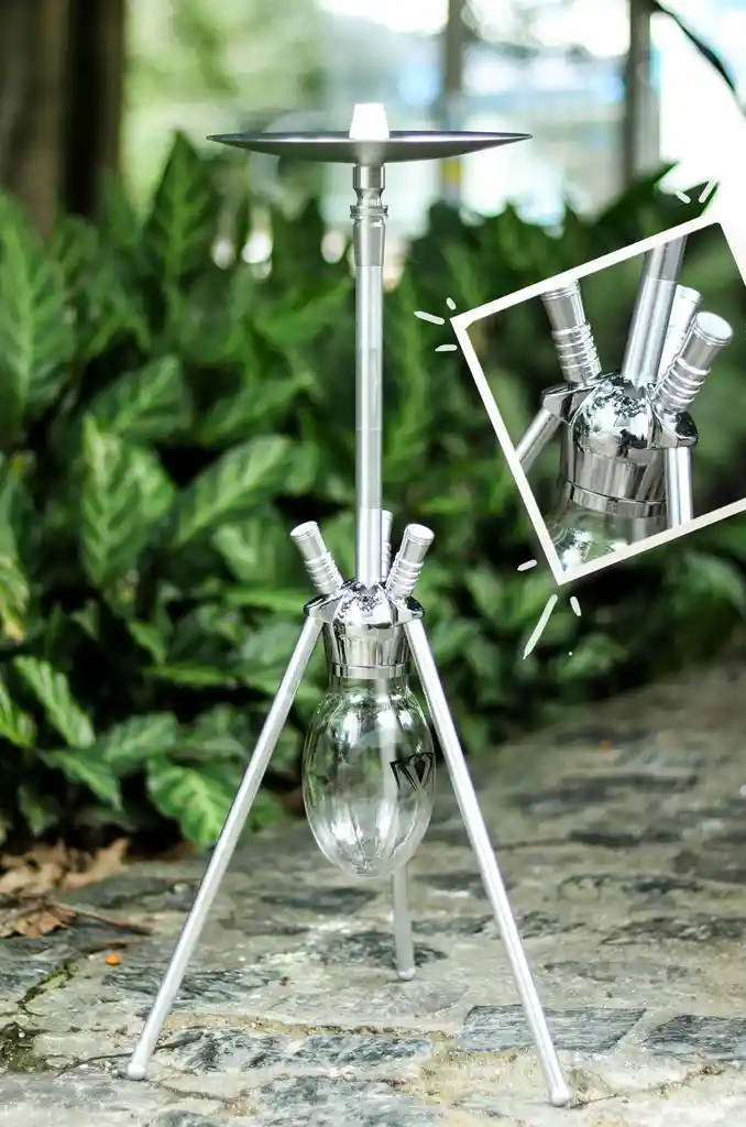Spider hookah, con jarrón de vidrio reforzado, cerámica de barro y manguera de silicona. Material: Acero inoxidable