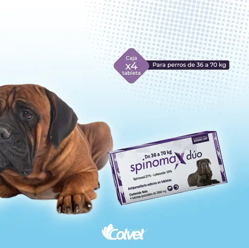 Antiparasitario externo Fórmula: Spinosad 27%, Lufenurón 10%. Indicaciones: Pulguicida. Combina la rápida acción adulticida del Spinosad con la actividad del Lufenurón sobre el ciclo ambiental de la pulga. Dosis: Caninos: 1 o 2 comprimidos juntos por animal, según peso. Intervalo entre dosis: 30 días. Duración del tratamiento: Se recomienda administrar desde 1 mes antes del período de mayor actividad de las pulgas y continuar mensualmente hasta el final de la temporada de pulgas. Vía de administración: Oral. Presentación: Cajas individuales según kilaje (Caninos de 2 a 4 kg; de 4 a 9 kg; de 9 a 18 kg; de 18 a 36 kg y de 36 a 70 kg). • ¡Rápida acción y alta eficacia! • ¡Elimina las pulgas durante 30 días! • Seguro y de fácil dosificación. • Los baños no alteran su eficacia. • ¡Palatable! • Efecto ambiental.