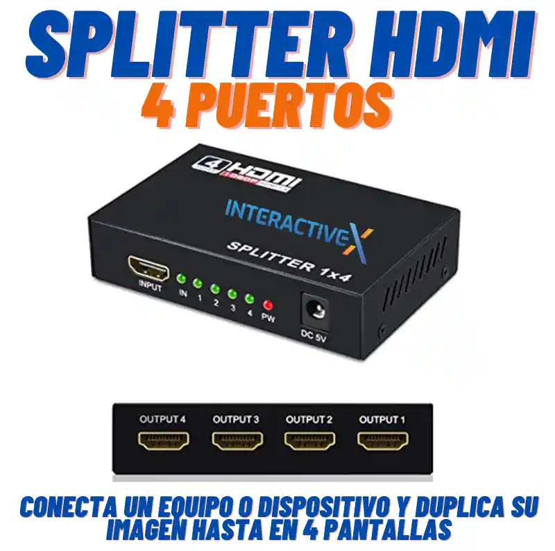 El Splitter permite que uno de los dispositivos HDMI se divida fácilmente en cuatro monitores o proyectores compatibles con HDMI dando la misma imagen, Soporta Full HD, Full 3D. Puedes Conectar un dispositivo HDMI y conectar hasta 4 Pantallas duplicando la imagen. ( No genera Escritorios Independientes)