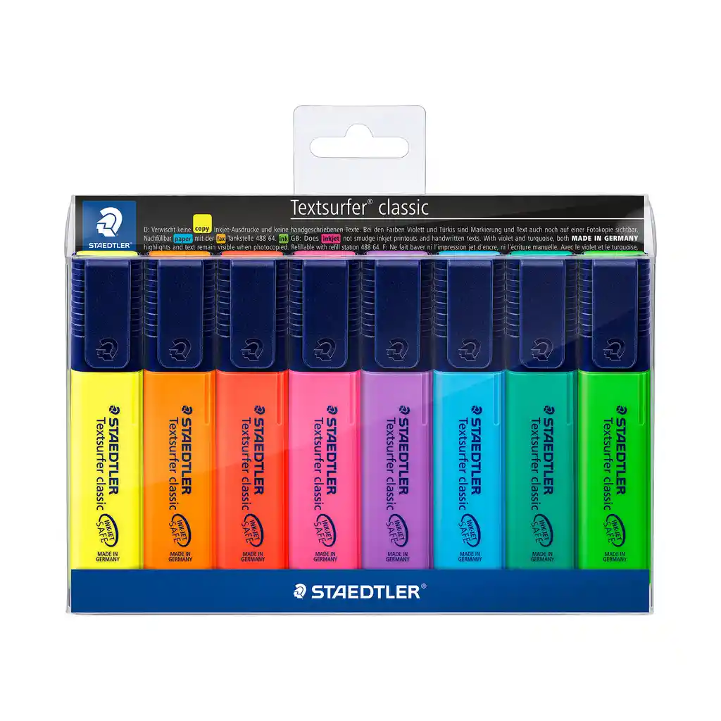 Textsurfer classic, Recargable Resaltadores | STAEDTLEREstuche con 8 colores surtidosInformación del productoResaltador con depósito de tinta grande para un rendimiento de resaltado extralargoINK · JET SAFE: no mancha las impresiones de inyección de tinta ni los textos escritos a manoPrueba de copia: violeta y turquesa para los documentos que se van a copiarPara copias en papel, fax y carbónSecado rápidoTapa giratoria para facilitar la aperturaEl cilindro y la tapa de PP garantizan una larga vida útilSeguro para aviones: la ecualización automática de presión evita que el lápiz se filtre a bordo del aviónPunta de cincel ultrasuave aprox. 1 - 5 mmRecargableNúmero de artículo: 364 WP8Hecho en AlemaniaCalidad, buen servicio y precio justo!Butaca Art