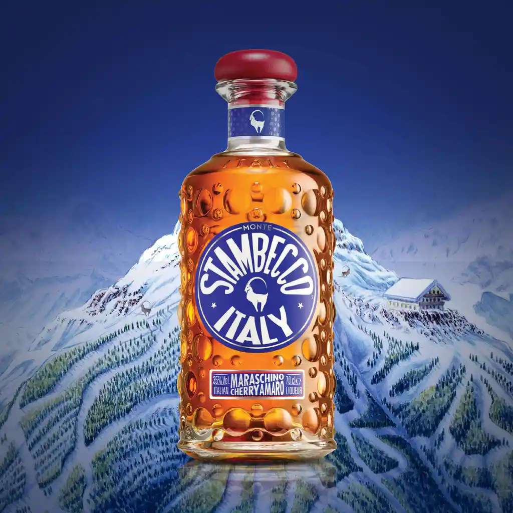 Stambecco es una marca italiana de licores, específicamente un amaro, que se elabora con ingredientes naturales y botánicos, incluyendo cerezas marrasquino.