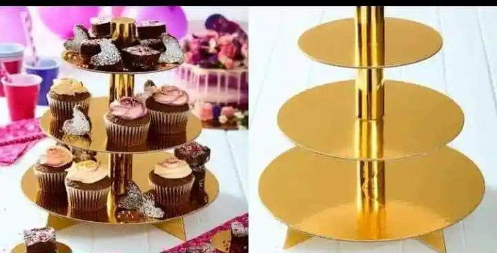 Exhibidor dorado, ideal para cupcakes o mesa de dulces y demás usos. Capacidad:24 cupcakes. Dimensiones 30x30cm.