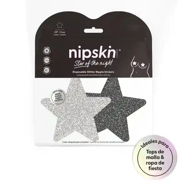 Tapa Pezón en Estrella, stickers adhesivos para un solo uso. Vienen 2 pares de cubre pezones; 1 par en forma de estrella con escarcha plata, y 1 par en forma de estrella con escarcha negra. Vienen con un centro suave y no adhesivo para mayor comodidad y protección del pezón. Son la solución perfecta para cubrir tus pezones, al usar mallas o prendas con transparencias. También son el accesorio perfecto para tus outfits de festivales, conciertos o disfraces. Son flexibles lo cual permite que se adapten a la forma de culaquier seno. Adicionalmente, son impermeables y transpirables, por lo que resisten al agua y al sudor.