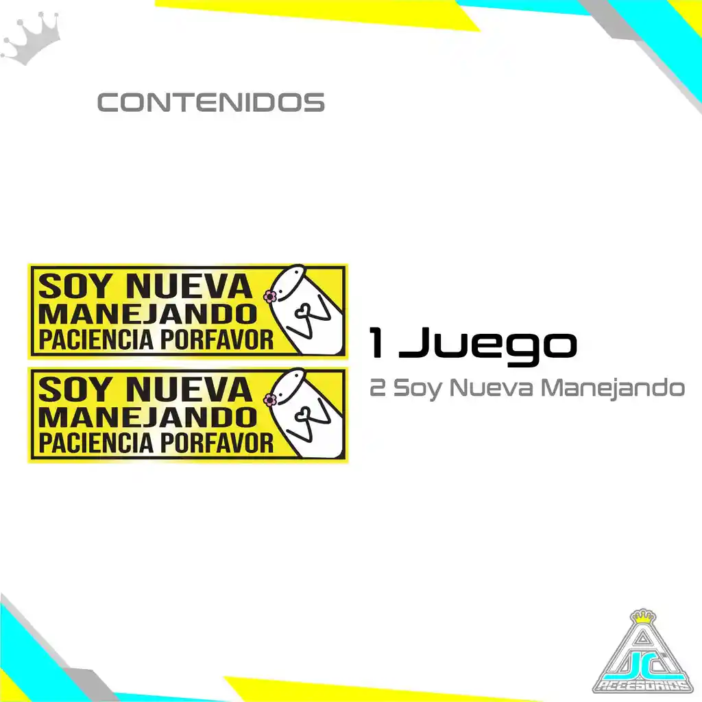 Sticker Reflectivo “Soy Nueva Manejando” 15x4,5 cm Aviso adhesivo reflectivo ideal para conductoras nuevas que desean mayor seguridad y comprensión en la vía. Su diseño compacto permite instalarlo fácilmente en el vidrio trasero sin afectar la estética del vehículo. ESPECIFICACIONES: Medidas: 15 x 4,5 cm Material: Vinilo adhesivo reflectivo para exteriores Impresión: Alta resolución Uso: Interior y exterior Instalación: Fácil aplicación sobre superficie limpia y seca Resistente al agua, al sol y a las condiciones climáticas. Alta visibilidad de día y noche gracias a su acabado reflectivo. Producto nuevo, listo para envío inmediato.