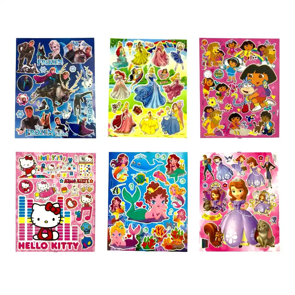 Stickers Calcomanías para Niños Incluye: 6 láminas (cada una con 10 calcomanías) Medida por lámina: 22.5 cm x 18 cm Diseños: Surtidos Características destacadas: - Stickers adhesivos fáciles de usar - Diseños vibrantes y llamativos que encantan a niñas y niños - Tamaño práctico para llevar en mochilas, cartucheras o estuches - Ideal para niños desde los 5 años, fomentando la creatividad y el juego.