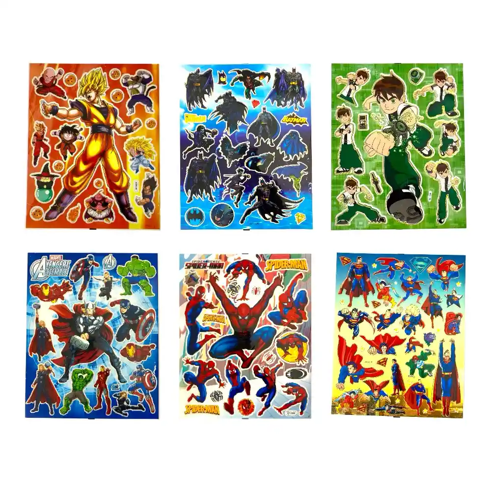Stickers Calcomanías para Niños Incluye: 6 láminas (cada una con 10 calcomanías) Medida por lámina: 22.5 cm x 18 cm Diseños: Surtidos Características destacadas: - Stickers adhesivos fáciles de usar - Diseños vibrantes y llamativos que encantan a niñas y niños - Tamaño práctico para llevar en mochilas, cartucheras o estuches - Ideal para niños desde los 5 años, fomentando la creatividad y el juego.