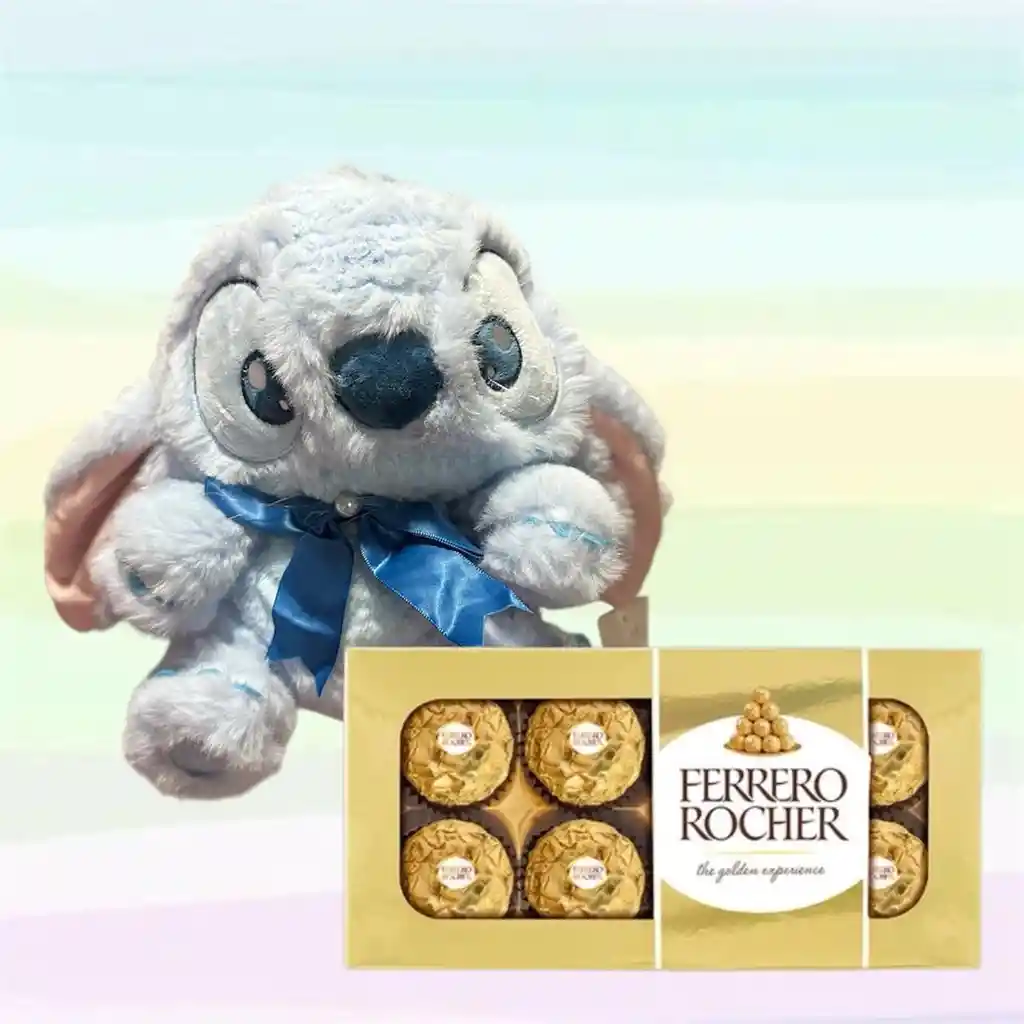 Un peluche Stitch tierno 🐾💙, acompañado de 8 Ferrero Rocher 🍫. Perfecto para regalar dulzura y ternura. ✨