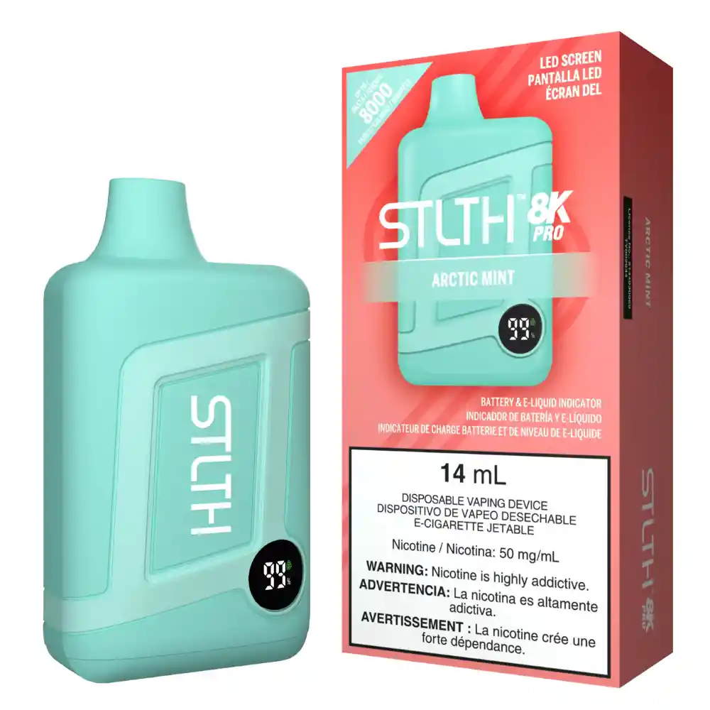 STLTH 8K PRO es un STLTH desechable que contiene 14 ml de e-líquido para hasta 8000 inhalaciones y está disponible con una concentración de nicotina de 20 mg/ml. La batería interna de 800 mAh es recargable y la pantalla LED indica el nivel de batería y e-líquido restante en el dispositivo.