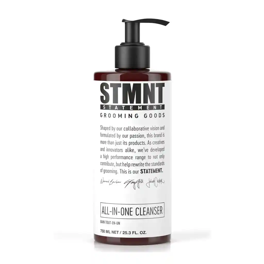 Stmnt Limpiador Todo en uno 750ml El limpiador todo en uno de STMNT Grooming Goods limpia el cabello, la barba, el cuerpo, la cara y las manos. La fórmula extra cuidadosa, con carbón activado y mentol, elimina las impurezas. Con un aroma de cítricos y lavanda redondeado con haba tonka. Beneficios - Elimina las impurezas del cabello, la barba, el cuerpo, la cara y las manos - Elaborado con carbón activado y mentol - Brinda una sensación extra fresca y limpia - Con un aroma de cítricos y lavanda redondeado con haba tonka - Fórmula súper liviana - Sin sulfato tensioactivos y aceites de silicona Modo de uso - Aplicar sobre el cabello húmedo y el cuerpo hasta formar espuma - Enjuagar bien con agua tibia