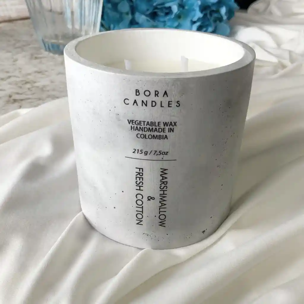 Una colección única y con sello propio. Es una vela cuidadosamente elaborada, con un aroma que se caracteriza por ser sutil y exuberante, que a la vez ilustra el equilibrio y la suavidad de los masmelos y el algodón. Los envases son elaborados por manos Colombianas, hechos a base cemento con efecto mármol que le dan elegancia a tus espacios. Si tu deseo es ambientar tus espacios preferidos, Marshmallow & Fresch Cotton es la mejor opción.**215gr/ 7oz. **2 mechas.**Envase de cemento. **Cera vegetal. ** Elaborada a mano.** Tiempo de combustión: 40-45 horas aprox.** Solo contiene la vela. Importante tener en cuenta las recomendaciones escritas en el producto.