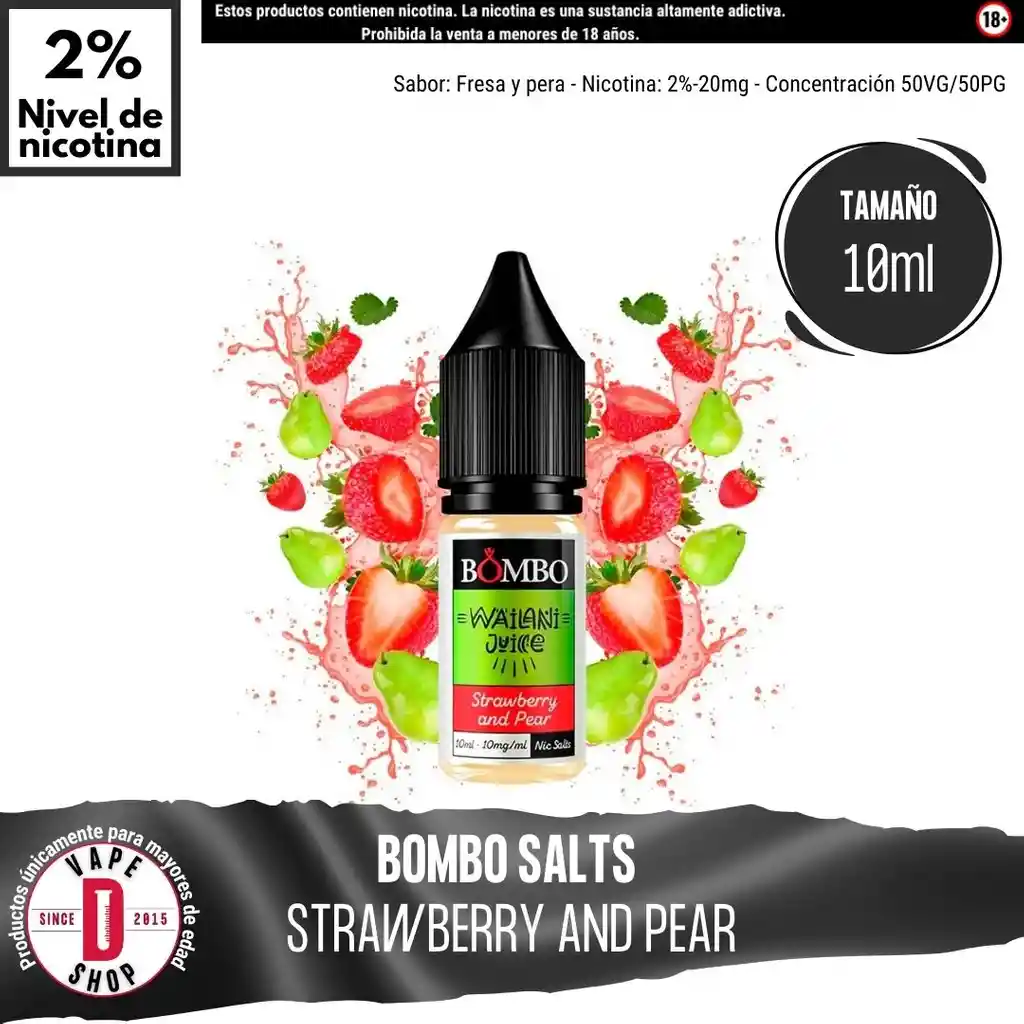 Combinación perfecta de la mejores fresas dulces y peras de agua con capas de hielo refrescante. Un e-liquid con un sabor frutal sublime para disfrutarlo a diario. Presentación: Botella de 10ml 50VG/50PG La elaboración y fabricación de las sales de nicotina se realiza en España con ingredientes de la máxima calidad. ➽ La seguridad, calidad y confianza priman en éstos líquidos✭✭✭✭✭ Advertencia: Contiene nicotina, que puede ser venenoso. Evitar el contacto con la piel y los ojos. No ingerir. Mantener siempre en empaque original y en un ambiente fresco y seco. Mantener alejado de niños y mascotas. No debe utilizarse por Mujeres en estado de embarazo o personas con problemas de respiración como el asma. Prohibida la venta a menores de 18 años. En caso de accidente contacte a la línea 123. Ingredientes: Glicerina Vegetal (USP), Propilenglicol (USP), Nicotina (USP), Extractos de sabor de grado alimenticio.