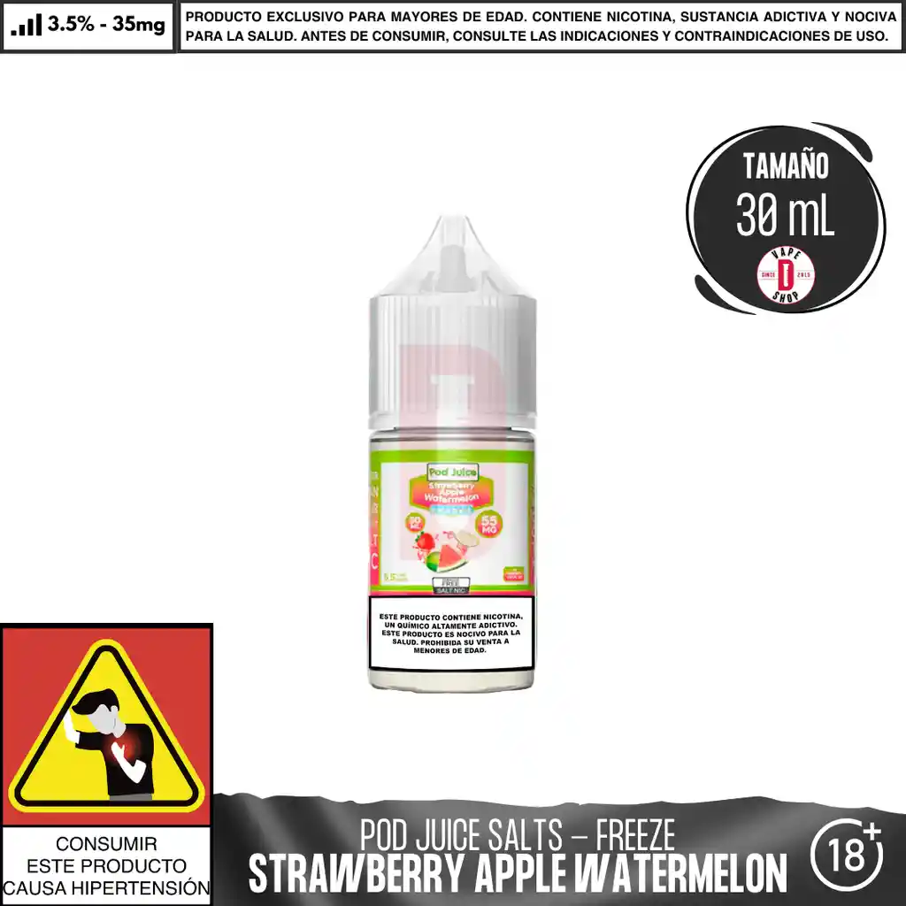 Echa un vistazo a Straw Apple Watermelon de Pod Juice, una mezcla de sal de nicotina helada de fresas dulces, manzana crujiente y deliciosa sandía que atraerá las papilas gustativas. Presentación: Botella de 30ml 50VG/50PG La elaboración y fabricación de las sales de nicotina se realiza en Estados Unidos con ingredientes de la máxima calidad. ➽ La seguridad, calidad y confianza priman en éstos líquidos✭✭✭✭✭ Advertencia: Contiene nicotina, que puede ser venenoso. Evitar el contacto con la piel y los ojos. No ingerir. Mantener siempre en empaque original y en un ambiente fresco y seco. Mantener alejado de niños y mascotas. No debe utilizarse por Mujeres en estado de embarazo o personas con problemas de respiración como el asma. Prohibida la venta a menores de 18 años. En caso de accidente contacte a la línea 123. Ingredientes: Glicerina Vegetal (USP), Propilenglicol (USP), Nicotina (USP), Extractos de sabor de grado alimenticio.