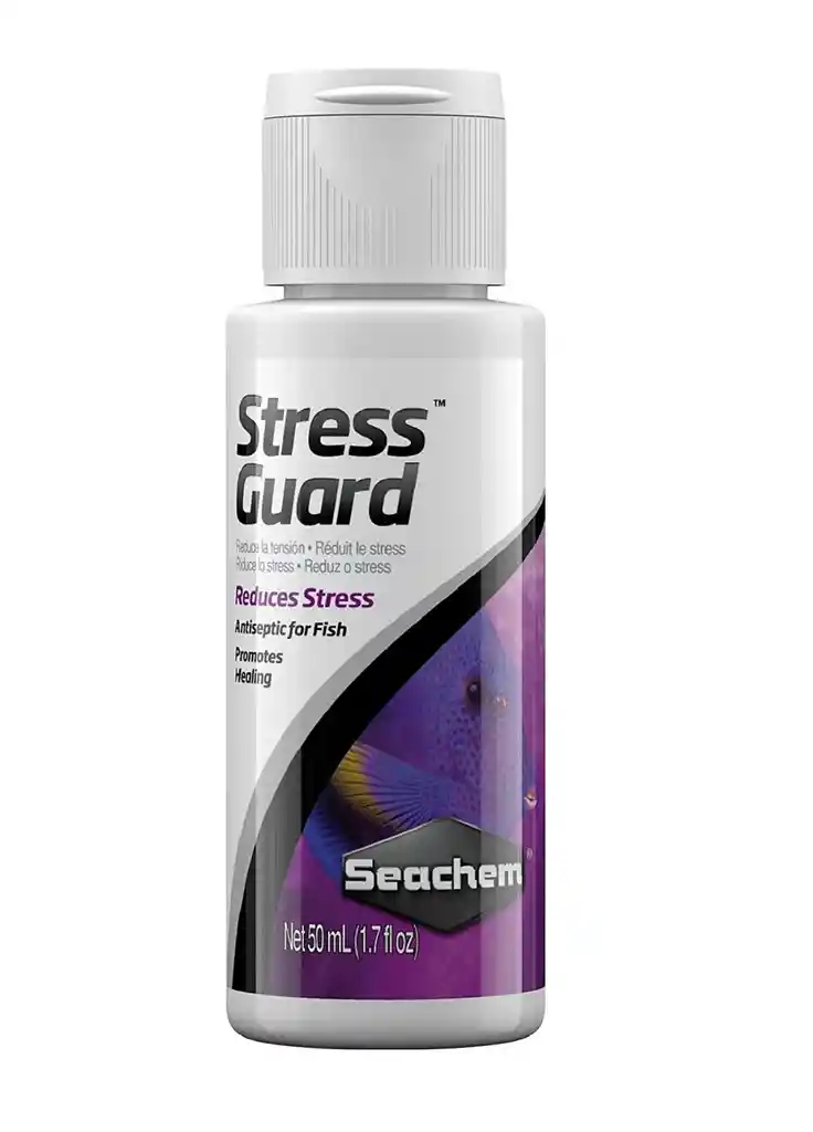 Frasco Stress Guard Seachem 50 mL - Reduce el estrés al manipular o transportar peces. - Antiséptico para peces. - Promueve la curación - Marina y de agua dulce - StressGuard ™ es el producto de protección premium de capa de limo. - StressGuard ™ reducirá el estrés y la toxicidad por amoníaco al manipular o transportar peces.