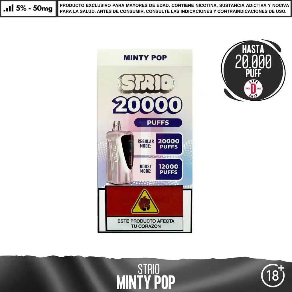 STRIO - 12000 a 20000 Puffs El STRIO desechable ofrece entre 12000 y 20000 caladas (Puff) aproximadas de 50mg de nicotina en un dispositivo compacto de 24mL. Perfecto para su uso en movimiento, este vapeo proporciona una experiencia satisfactoria con una conveniencia duradera. Disfruta de los sabores suaves y audaces con facilidad. Opciones: Berry Twist – Un delicioso giro de bayas variadas. Blue Razz Ice – Refrescante frambuesa azul con un acabado helado. Blue Trio Lemon – Limón infusionado con un trío de sabores azules. Cherry Lemon – Limón ácido combinado con dulce cereza. Cherry Raspberry – Dulce cereza mezclada con frambuesa ácida. Dragonfruit Fab – Sabor fabulosamente exótico de fruta del dragón. Fcuking Fab – Fabulosamente intenso y lleno de sabor. Grape Crush – Bondad de uva triturada. Miami Mint – Refrescante brisa de menta de Miami. Minty Pop – Estallido de frescura de menta fría. Nightcrawler – Misterioso y oscuro, como una aventura nocturna. Strawberry Mango – Dulce fresa mezclada con mango tropical. Watermelon Ice – Jugosa sandía fría a la perfección. Contenido del paquete: 1 dispositivo desechable Concentración de nicotina: 12000 PUFF - 20000 PUFF - 5% de nicotina salina en peso Características del dispositivo: Dispositivo de vapeo desechable 24 ml de capacidad 1 dispositivo por paquete Batería: 800 mAh 12000 caladas aproximadamente. Ingredientes: Glicerina Vegetal, Propilenglicol, Aromatizantes Naturales y Artificiales, Ácido Benzoico, Nicotina. Advertencia: Contiene nicotina, que puede ser venenoso. Evitar el contacto con la piel y los ojos. No ingerir. Mantener siempre en empaque original y en un ambiente fresco y seco. Mantener alejado de niños y mascotas. No debe utilizarse por Mujeres en estado de embarazo o personas con problemas de respiración como el asma. En caso de accidente contacte a la línea 123.