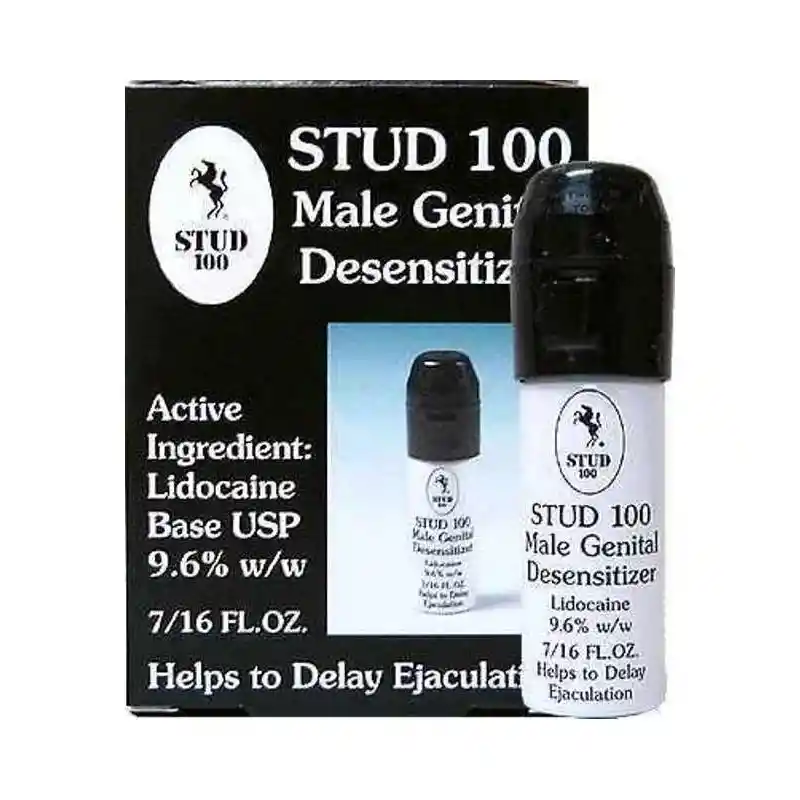 STUD 100 es un spray retardaste que ayuda a retardar la eyaculación para que puedas disfrutar de tus relaciones sexuales durante más tiempo. Lo puedes utilizar de forma discreta y sus efectos son rápidos en la mayoría de los usuarios. Stud 100 ayuda a: * Retrasar la eyaculación. * Prolongar tus relaciones sexuales para obtener un mayor placer. * Fácil aplicación. 3-4 puf 5-10 minutos antes de la relación sexual. * Obtienes resultados inmediatamente después de la aplicación. * Impresiona a tu pareja con la mayor duración. * Sin efectos secundarios. STUD 100 te puede ayudar a disfrutar de un mejor y más prolongado placer sexual tanto de manera individual como en pareja. Evita el stress que provoca la eyaculación prematura y siéntete libre para disfrutar del sexo. Este spray muestra los resultados muy rápidamente y añade resistencia a los hombres que sufren de eyaculación precoz. Te puede ayudar a sentir un mayor control sobre la eyaculación durante las relaciones sexuales.