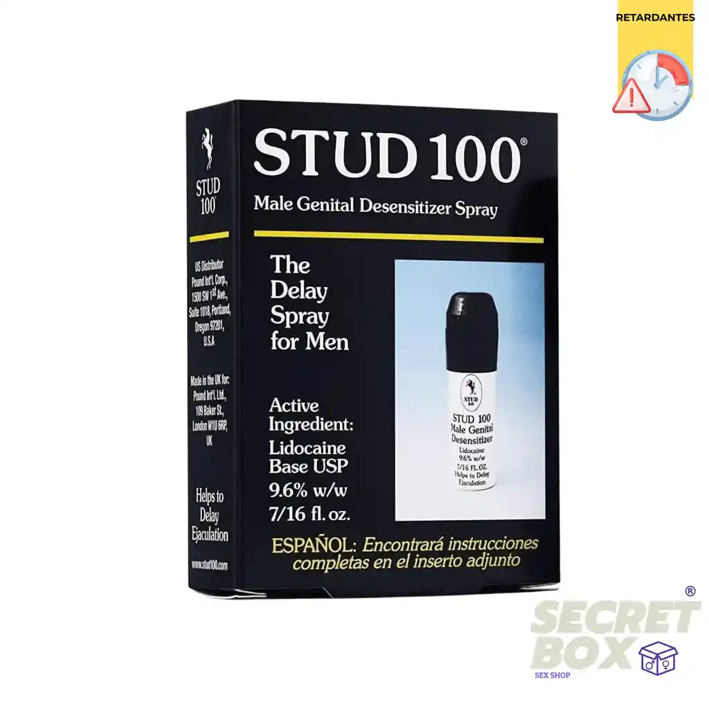 Stud 100 es un spray retardante masculino con lidocaína, diseñado para ayudar a retrasar la eyaculación y prolongar el tiempo de la relación sexual. Es uno de los productos líderes a nivel mundial en su categoría, fácil de usar y de acción rápida. Beneficios clave Spray retardante de acción localizada Fórmula con lidocaína al 9.6% Presentación de 12 g, hasta 120 aplicaciones Discreto, práctico y efectivo Producto líder internacional para control del tiempo íntimo Uso recomendado Aplicar de 2 a 3 atomizaciones sobre el glande del pene 5–10 minutos antes de la actividad sexual. Lavar con agua antes del contacto para mayor seguridad. Advertencias Uso exclusivo para hombres adultos. No usar en caso de alergia a anestésicos locales. Mantener fuera del alcance de los niños. Evitar uso excesivo o continuo sin supervisión médica.