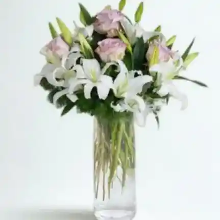 Jarron de 12 rosas color lila y 5 lirios blancos. La flor puede ser sustituida dependiendo la disponibilidad de color y del producto “Mensaje Personalizado” máximo de 30 caracteres (Dejar el mensaje en el chat, los comentarios no se previsualizan para la tienda por lo que si se dejan allí no podrá ser incluido)