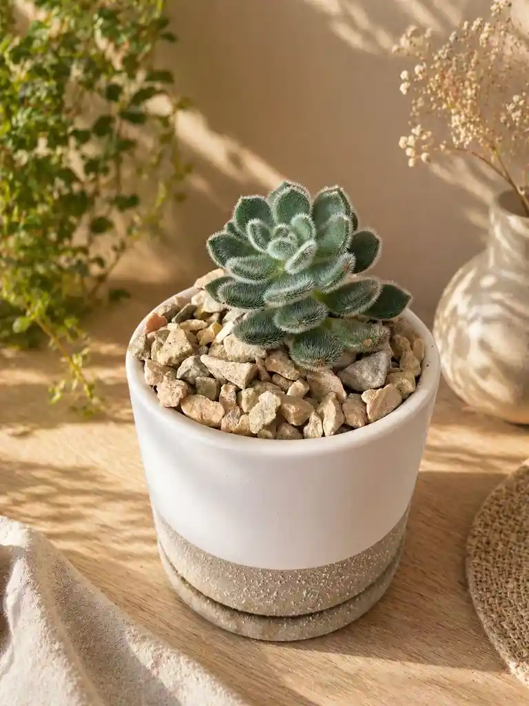 Hermosa suculenta natural sembrada en elegante matera de cerámica decorativa. Perfecta para decorar hogares, oficinas o regalar en ocasiones especiales. Su diseño moderno y compacto aporta un toque natural y sofisticado a cualquier espacio. Las suculentas son plantas de fácil cuidado, ideales para quienes buscan una opción decorativa que requiera poco mantenimiento. Incluye: • 1 suculenta natural • Matera decorativa de cerámica • Sustrato especial para plantas Ideal para: • Decoración de hogar u oficina • Regalos especiales • Espacios pequeños