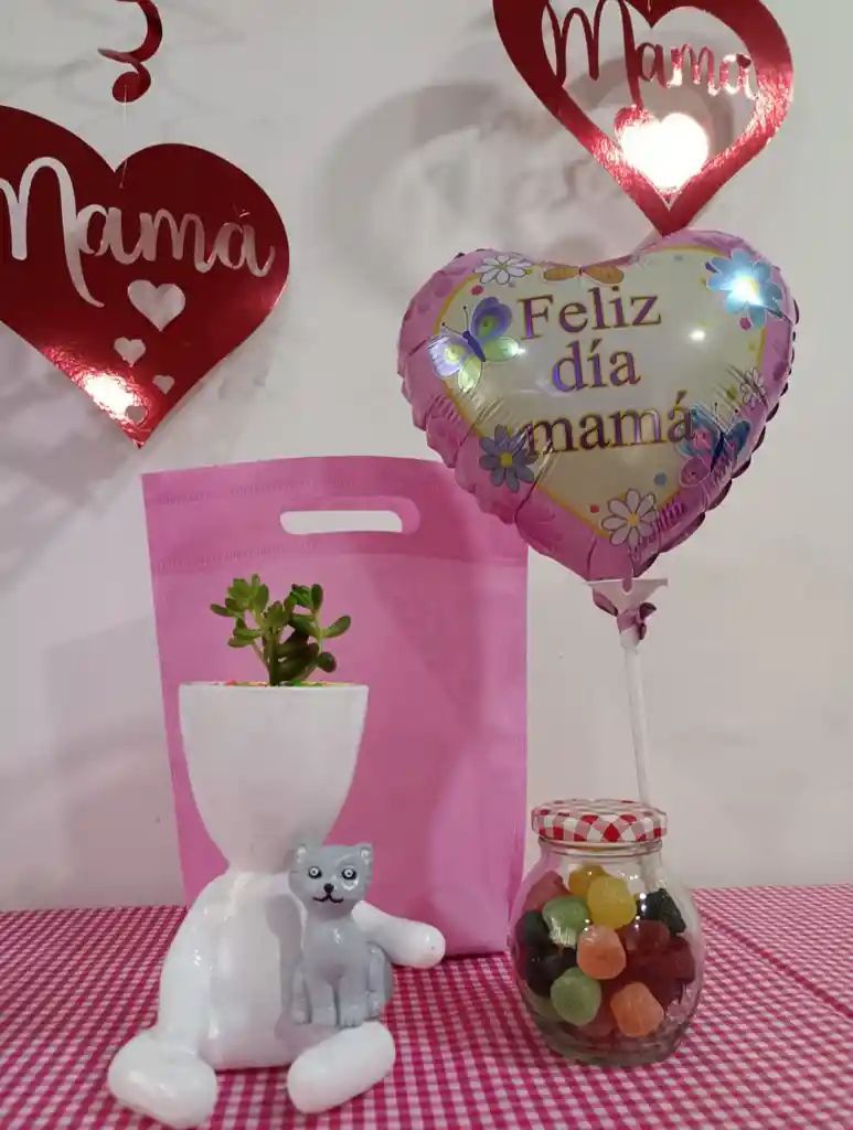Suculenta humano con gato con matera en cerámica ,frasco de vidrio con dulces ,globo feliz día de la madre y bolsa de tela.
