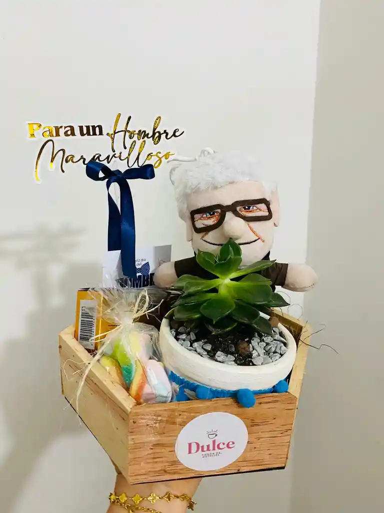 Hermoso Detalle con muñeco de peluche Abuelito Up, suculenta natural, cahita de chocolates Moments, gomitas y masmelos.