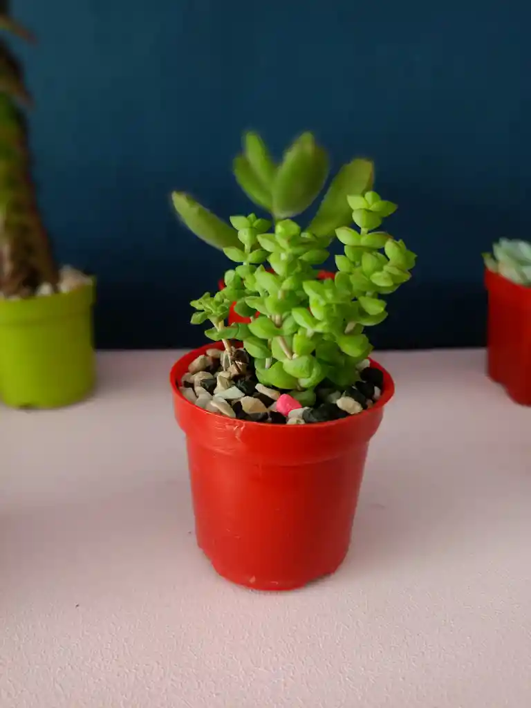"Suculenta pequeña con hojas suaves. Tallo corto y grueso. Perfecta para decorar espacios pequeños y requiere cuidado mínimo."