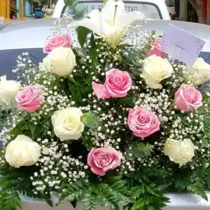 sudario elaborado con 24 rosas , helecho , lirios y gipsofilia.