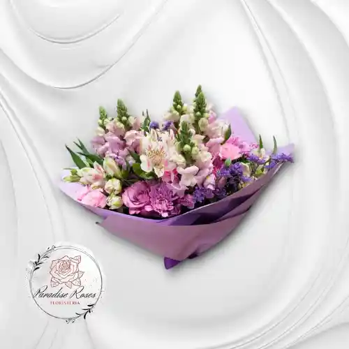Hermoso bouquet en tonos rosados y lilas con flores delicadas que transmiten alegría, dulzura y elegancia. Ideal para celebrar cumpleaños, nacimientos, felicitaciones o alegrar el día de alguien especial.